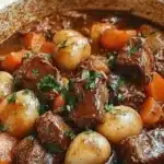 A comforting and hearty dish filled with tender beef, vibrant vegetables, and aromatic herbs, perfect for chilly evenings.