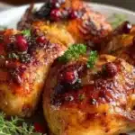 A warm, vibrant roast chicken dish featuring a harmonious blend of sweet maple syrup and tart cranberries, perfect for holiday gatherings.