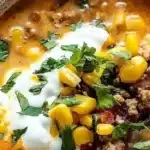 A comforting and creamy taco soup, perfect for cozy family gatherings, filled with spices, vegetables, and a velvety texture.