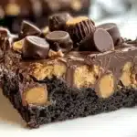 Decadent Reeses Peanut Butter Earthquake Cake topped with chocolate and peanut butter.