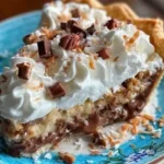 A rich and creamy pie with layers of chocolate, toasted coconut, and pecans that evoke comfort and nostalgia.