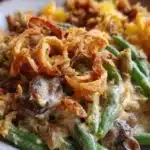 A nostalgic and comforting dish made with fresh green beans, creamy mushroom sauce, and crispy fried onions, perfect for family gatherings.