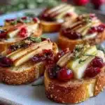 A delightful appetizer featuring crispy baguette slices topped with creamy brie, fresh pear, and tart cranberry sauce.