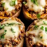 Delicious sweet potatoes stuffed with savory ground turkey, fresh vegetables, and a sprinkle of cheese, creating a comforting and nutritious meal.